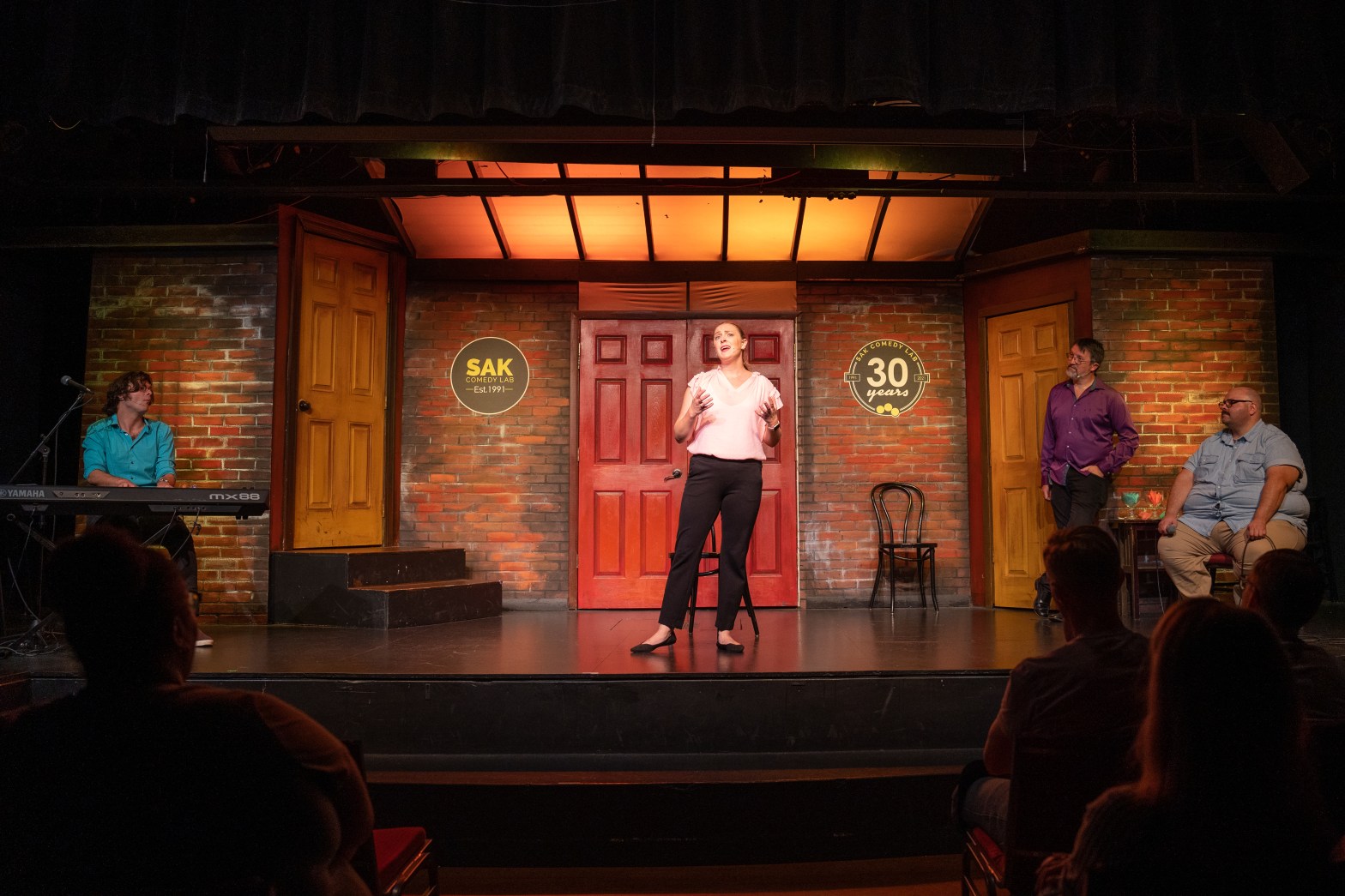 An audience member helps improvisers create large and memorable characterizations in Family Dinner.